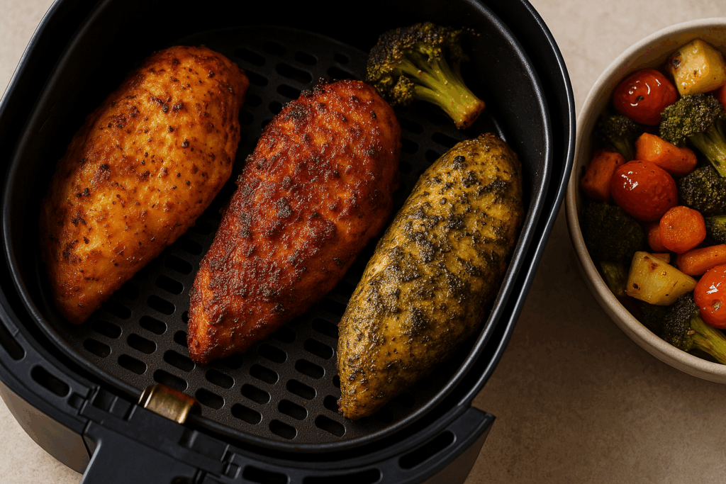 - Ganze Hähnchen-Filets: Aufheizen am besten auf 200°C. Die Garzeit beträgt etwa jeweils 6 Minuten von beiden Seiten bei 200 °C.