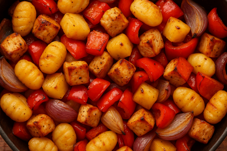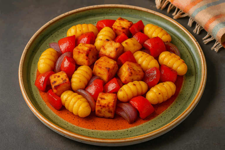 - Dann die marinierten Hähnchenstücke, Ananas und Gemüse mit den Gnocchi vermischen, die Hälfte in den vorgeheizten Airfryer geben (je nach Größe des Airfryers, kann man auch mehr in den Korb geben. Meiner hat ein Fassungsvermögen von 6 Litern) und bei 180 °C für 10-15 Minuten garen. Korb zwischendurch schütteln.